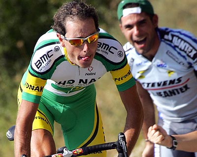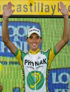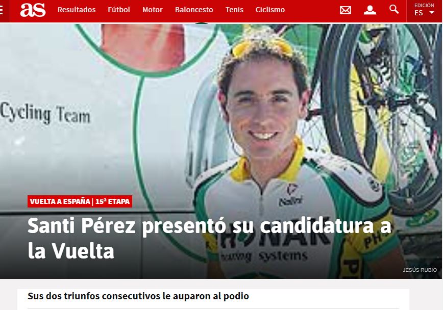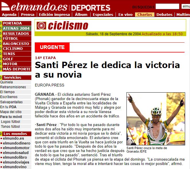 Ahora que estoy mirando de reojo la Vuelta Ciclista a España (nada que ver con la atención que le dedicaba hace años) me he acordado de un ciclista fugaz, un torbellino que despuntó en la Vuelta de 2004 y desapareció con la misma celeridad. Su nombre es Santi Pérez, natural de Grado, Asturias. Nacido en 1977, los que éramos aficionados al ciclismo por aquellos años no lo conocíamos hasta aquella Vuelta en la que puso contra las cuerdas al ídolo español del momento, Roberto Heras. Santi Pérez comenzó la Vuelta sin grandes expectativas, sin aparecer en exceso durante las primeras etapas, en las que perdió un tiempo que luego le habría hecho falta para competir por el triunfo final. Fue a partir de la decimocuarta cuando saltó a la primera línea con el triunfo en la etapa que iba de Málaga a Granada. Apenas dos días antes, Roberto Heras había arrebatado el liderato al norteamericano Floyd Landis, y la victoria de Santi Pérez no parecía más peligrosa que la del típico ganador ocasional de etapa, un tipo combativo, buen escalador, que había sabido aprovechar su momento. Pero es que al día siguiente, en la decimoquinta etapa, Santi Pérez volvió a alzarse con el triunfo en la estación de esquí de Sierra Nevada, una cronoescalada en la que le metió un minuto a Alejandro Valverde y casi dos al maillot amarillo, Roberto Heras. ¿Pero de dónde ha salido este bólido?, nos preguntamos muchos.