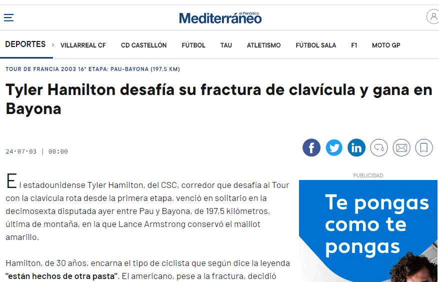 El mazazo llegó poco después, en octubre, apenas un mes después de su éxito en la Vuelta: la UCI le notificó su positivo en un análisis por transfusión homóloga de sangre. El mismo positivo que dio su compañero de equipo, el norteamericano Tyler Hamilton, otro al que recuerdo una de las exhibiciones más portentosas sobre una bici, cuando se marchó del pelotón en una etapa del Tour de Francia… con la clavícula rota. Santi Pérez nunca reconoció su positivo, recurrió por las diversas irregularidades que se cometieron durante el contranálisis, pero la UCI y el TAD mantuvieron su decisión: Santi Pérez fue sancionado dos años.