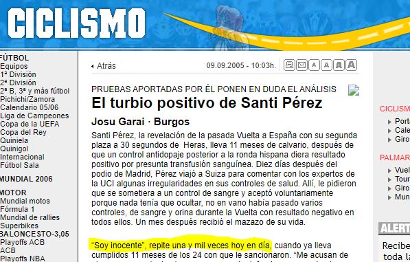 Santi Pérez siempre reclamó su inocencia, le dieron la razón en uno de sus dos recursos y no tuvo ninguna sanción deportiva por su supuesta implicación en la Operación Puerto. Volvió al ciclismo casi por la puerta de atrás, en un equipo con varios de los «renegados» y apartados del pelotón (Mancebo, Vicioso, Sevilla, Hruska), pero no volvió a tener resultados destacables. Cada vez que he leído una entrevista suya, y se ha prodigado poco, he sentido cierta lástima, la pena de un amante del ciclismo que se sintió maltratado por los que lo ayudaron a subir. Si alguien quiere saber mi opinión sobre el dopaje en aquellos años de principios del siglo y la pureza de algunos corredores, solo tiene que mirar la lista de los primeros clasificados en aquellos Tour de Francia: ¿a partir de qué posición debemos creer que corrían «limpios»?