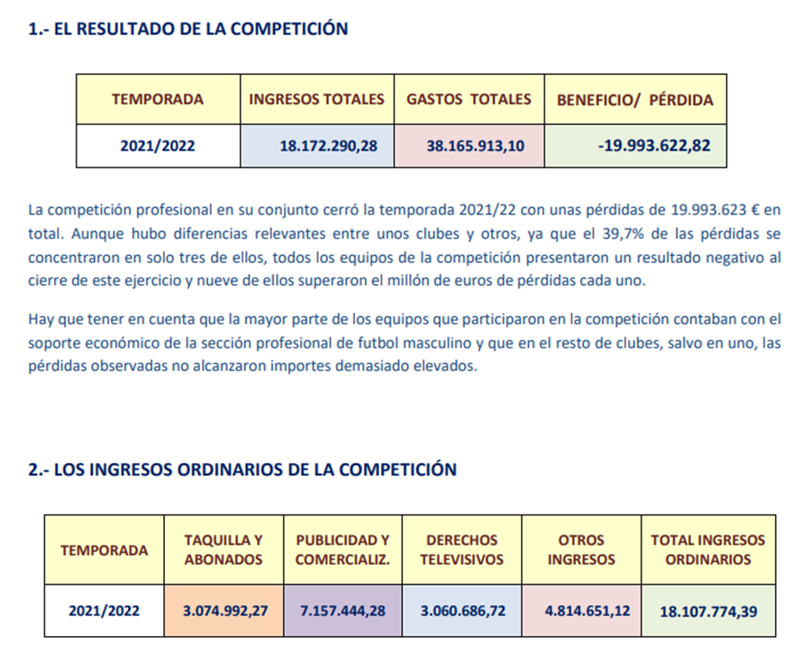 Según el Informe del Consejo Superior de Deportes sobre la situación económico-financiera del fútbol profesional femenino en España, los 16 clubes de la Liga F acumularon una pérdida de casi 20 millones de euros en la temporada 2021-22.