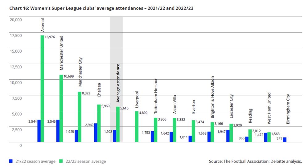 Los 17.000 espectadores del Arsenal o los más de 10.000 del Manchester United ya empiezan a ser cifras relevantes, en línea con las de algunos equipos masculinos de la Primera española y con muchos de la Segunda. El Mundial de Australia y Nueva Zelanda ha contado con una media de asistencia a los estadios de 30.904 espectadores, lo cual es una mejoría considerable con respecto al Mundial de Francia en 2019, con cifras en torno a las 21.700 personas por partido. Ambos datos, siendo buenos y esperanzadores para los seguidores del fútbol femenino, aún quedan lejos de los 37.000 espectadores de media que hubo en el Mundial de Estados Unidos de 1999, un país de larga tradición en este tipo de campeonatos.