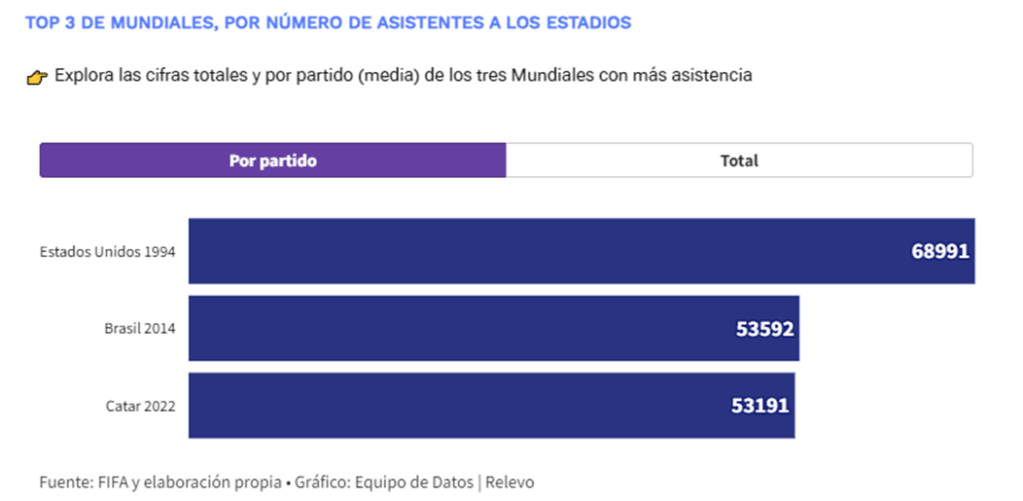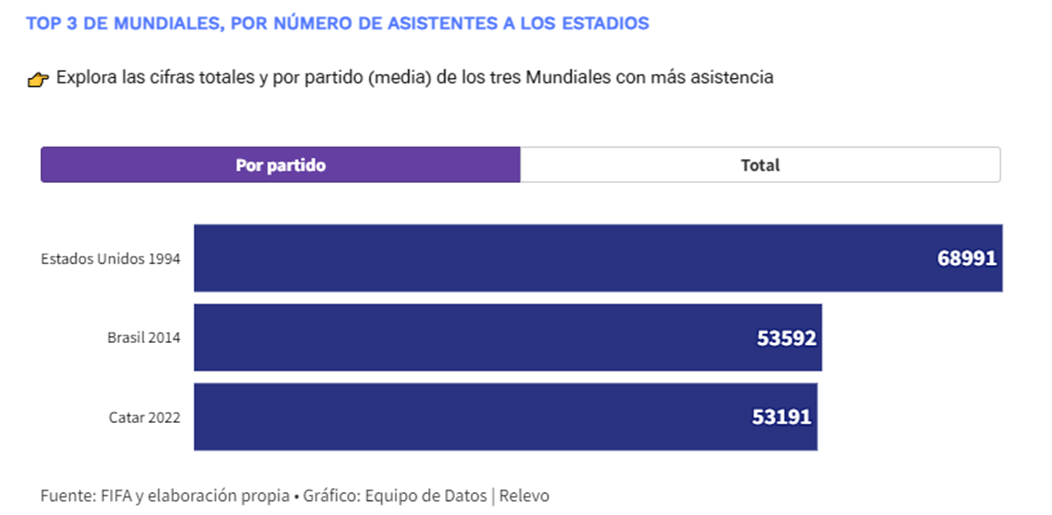 Por seguir con la comparación, en el Mundial masculino de la Infamia celebrado en Catar, la asistencia media fue de 53.191 espectadores, una cifra muy cercana a la de Brasil 2014 y muy lejos de la que se alcanzó en Estados Unidos en el 94.