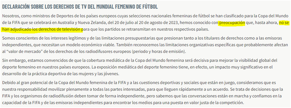 El fútbol femenino está creciendo mucho, eso es indudable, pero las diferencias económicas siguen siendo importantes, motivadas por el dispar volumen de ingresos que generan ambas modalidades. La principal partida de ingresos de un torneo de estas características se genera con la venta de los derechos de televisión. Cuando quedaba apenas un mes para el inicio del Mundial femenino, los ministros de Deportes de España, Alemania, Francia, Reino Unido e Italia publicaron una declaración conjunta en la que manifestaban su preocupación por el hecho de que la subasta de los derechos de televisión para el Mundial había quedado desierta y ni siquiera estaba claro que los partidos fueran a ser retransmitidos.