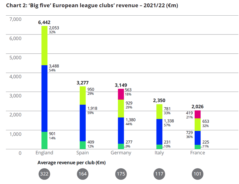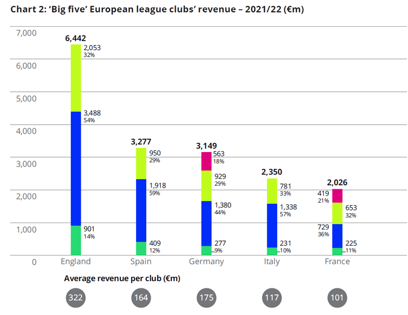 Cualquier análisis que se realice sobre los salarios de las féminas (muy bajos en el 95% de los casos) y de sus colegas masculinos (estratosféricos en un porcentaje cercano al 100%) debe partir del análisis del mercado global del fútbol. De acuerdo con el Informe de Deloitte Annual Review of Football Finance 2023, el mismo que utilicé para el post sobre el estado del fútbol europeo, los ingresos generados por las cinco principales ligas de fútbol masculino fueron de 17.200 millones de euros en la temporada 2021-22 y se esperaba superar los 18.000 millones en la 2022-23.