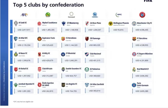 Los clubes ceden a sus muy bien remunerados jugadores, su principal activo, a unos tipos de las federaciones que los utilizarán durante un mes o más, sin preocuparse de su estado de saludo, del cansancio o de las posibles lesiones. La FIFA abona una ridiculez a los clubes por esta cesión. Esta tabla recoge lo que percibieron los principales clubes de cada una de las confederaciones por la cesión. Al igual que en Rusia 2018, el Manchester City fue el que más ingresos obtuvo, apenas 4,6 millones de dólares.