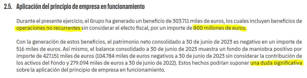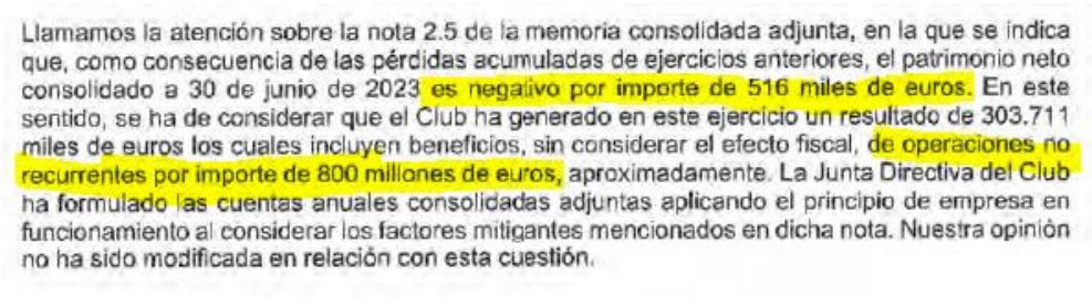 427 millones de euros positivo… teóricamente. Si no tuviéramos en cuenta los ingresos no recurrentes o extraordinarios de los últimos dos ejercicios, la situación será aún más preocupante de lo que ya es con la deuda a largo, al situarse en negativo (104,7 mill.). El propio auditor hace referencia a este desequilibrio al manifestar sus dudas respecto a la continuidad del club en el apartado de «principio de empresa en funcionamiento»:
