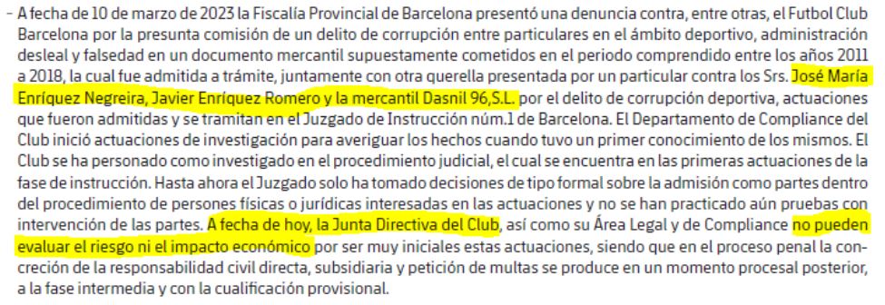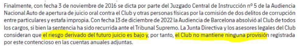 - Indica que el club no ha reconocido el posible pasivo contingente que supondría una sanción por los pagos a Negreira. No sé si la directiva tiene claro que no va a haber sanción en España (yo estoy convencido, pese al escándalo que supone) y cuenta con que la UEFA actuará del mismo modo tras comprobar la pasividad de la justicia española, pero simplemente una expulsión de la Champions sería un desastre económico para el club. Por ello han decidido no provisionar una pérdida de ¿50-80 millones de euros, quizás más? por esta contingencia que se resolverá en un plazo muy largo.