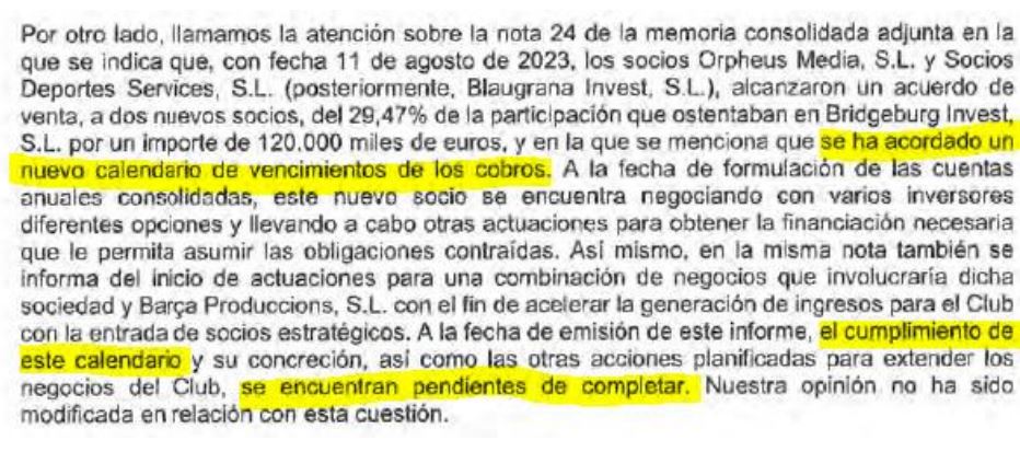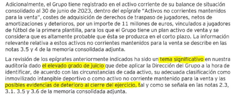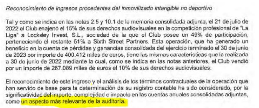 Por si todo lo anterior no fuera suficiente, el auditor incluye dos Párrafos de énfasis sobre dos apartados de las cuentas. Es su manera de insistir a los socios (y debería serlo igual para los responsables del control económico de LaLiga y la UEFA) en que centren su atención ahí, en esos puntos: