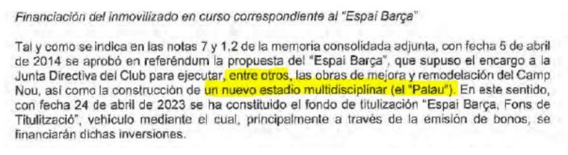 - Dedica un amplio apartado al Espai Barça y menciona de manera expresa la construcción prevista inicialmente de un nuevo Palau, aprobado en Junta: