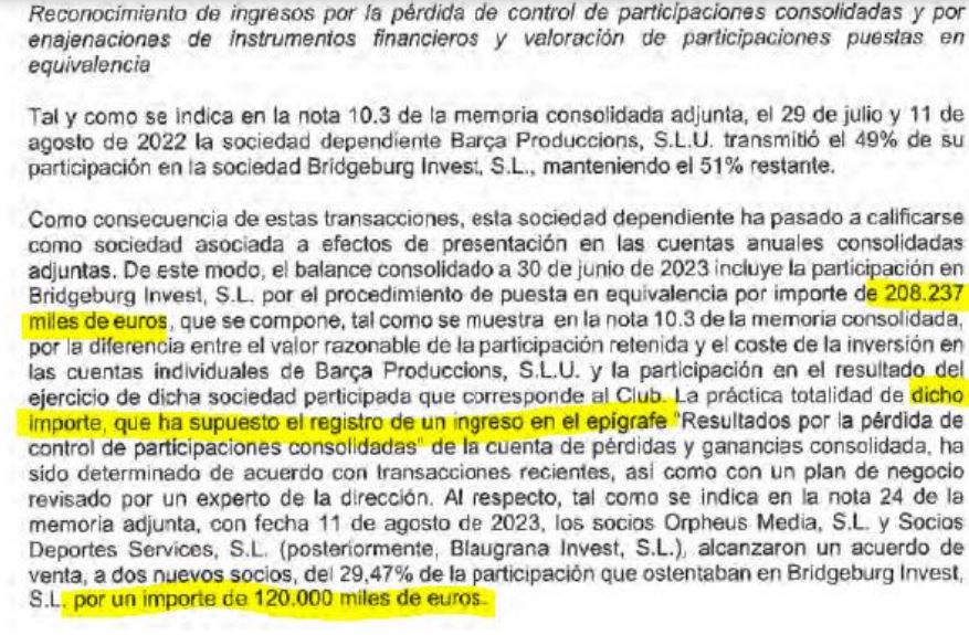 - Y por último (y me froto las manos), se hace una extensa mención a la investigación del club por «corrupción deportiva» continuada, falsedad documental y administración desleal por los pagos a las empresas de Enríquez Negreira para «garantizar la neutralidad» de los arbitrajes… ah, no, que eso no lo dice el club, lo dijo el propio receptor de los pagos. El club no ha provisionado ninguna partida por la dificultad para evaluarla y por considerar que está en una fase preliminar de la investigación. La realidad es que un descenso de categoría (que no ocurrirá jamás por mucho que lo merezca, porque el Barça, si hace falta, será incluido en la Ley de Amnistía) o una expulsión de la Champions supondrían una merma de los ingresos por derechos de televisión superiores al noventa por ciento. Derechos que, además, han sido vendidos parcialmente a un fondo.