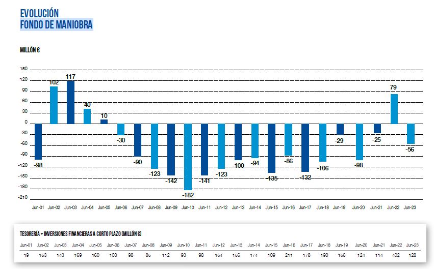 El fondo de maniobra mide la diferencia entre la deuda de una sociedad a corto plazo (pasivo corriente) y los activos líquidos en el corto plazo (activo corriente) para afrontar la misma. En el caso del Real Madrid, el saldo es negativo de manera estructural, es algo habitual. El propio equipo gestor del club explica que es así desde hace años de manera sistemática, debido al devengo de las fichas de los futbolistas y al cobro de las cuotas de los socios. Como las cuentas se cierran en junio, el club cancela estos saldos en el segundo semestre del ejercicio y vuelve a generarlos en el primero del año siguiente. Quizás para tranquilizar al socio que pueda preocuparse por este fondo de maniobra negativo recurrente, el club incluye, junto a su evolución, la elevada tesorería disponible (parte inferior), que será la que le permita afrontar los pagos sin mayores problemas.