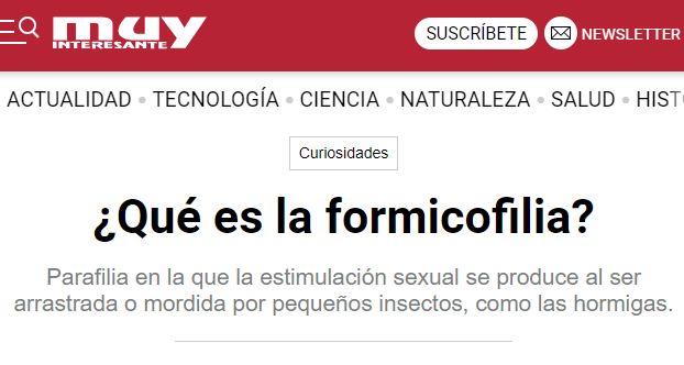Si la gente que practica el sexo con árboles o se excita poniéndose hormigas en sus partes no están de manicomio, yo ya no sé… pero supongo que hay que respetar la «diversidad» como nos cuentan, siempre y cuando no afecten a terceras personas. En el caso de la formicofilia, mi duda radica en saber si entran en conflicto la Ley de libertad sexual con la de Bienestar Animal, pero lanzo la pregunta al aire por si los que parieron ambas leyes tienen a bien contestar.