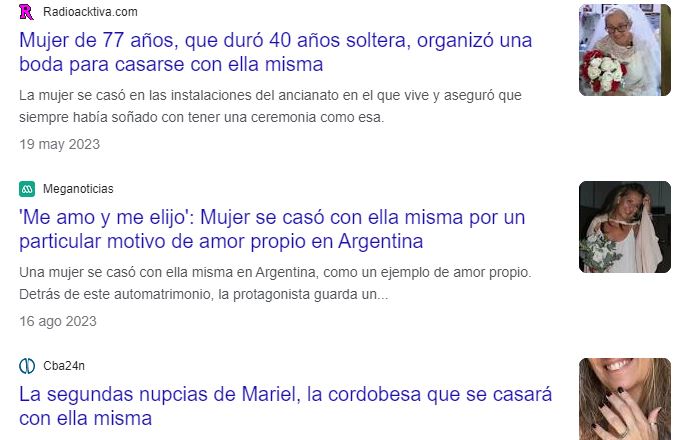 Una de estas mujeres (no es coña) se casó consigo misma y se separó pocos meses después porque dijo que no se aguantaba. Era argentina. Quizás pensó que su cónyuge hablaba demasiado. En el fondo, yo creo que hay mucha gente necesitada de atención y estas pseudobodas son una manera de ganársela. Ya han inventado una palabra para esta práctica: soligamia. En algún artículo leí que la motivación de estas personas era el amor, porque «se amaban mucho a sí mismas». En mi adolescencia eso se llamaba masturbación y era un acto íntimo, no había por qué montar un sarao con amigos ni compartir ese sentimiento con los demás.