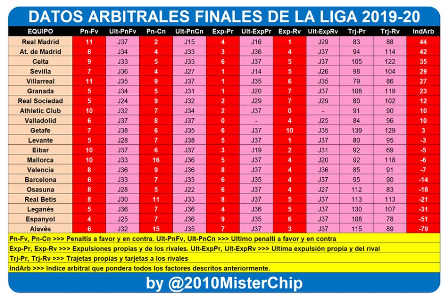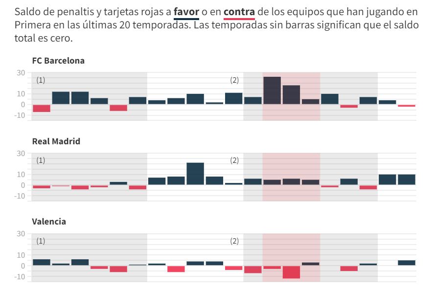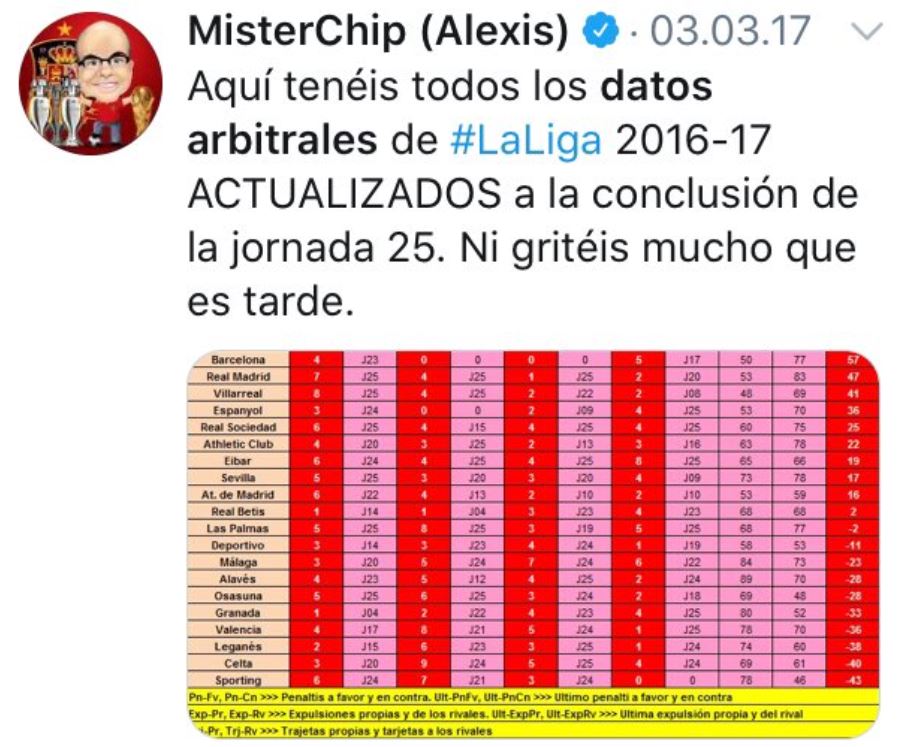 – Fue a partir de las declaraciones del vicepresidente del Fútbol Club Barcelona, Alfons Godall, en 2012, cuando mencionó ese concepto del “saldo arbitral”, la diferencia entre lances favorables y desfavorables. Lo que hicimos fue trasladar sus palabras al Excel, qué diferencias había entre los penaltis y las tarjetas rojas a favor y en contra que recibían los equipos. Como en aquel momento estábamos en plena guerra entre Mourinho y el resto, nos concentramos en analizar solo los datos del Real Madrid y del Fútbol Club Barcelona, pero fue Juanpa quien insistió, y acertó, al introducir en el estudio al resto de los principales equipos.