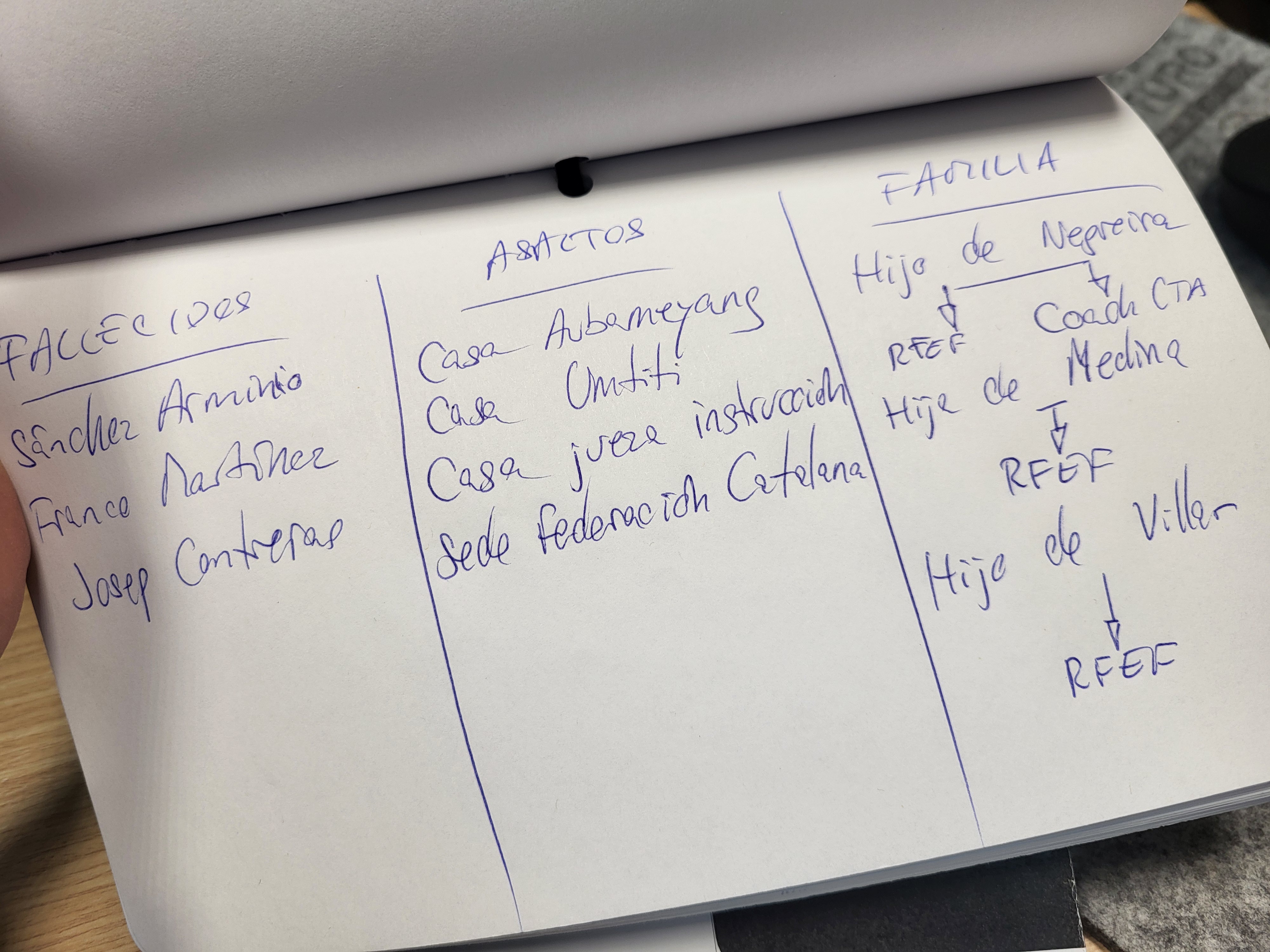 La abogada Luisa Ramírez se dio cuenta de un hecho que, a buen seguro, había pasado desapercibido para la mayoría de los asistentes. Durante las declaraciones de los días previos, Negreira se había mostrado algo despistado, incluso ido. Por momentos dormitaba en su asiento y parecía estar allí de cuerpo presente, pero ausente, como si la cosa no fuera con él. Sin embargo, durante la declaración de Ángel Villar, estuvo pendiente de cada una de sus palabras, miraba fijamente al antiguo jefe de su jefe con una sonrisa siniestra, incluso se le intuía un cierto brillo en la mirada. Finalizada la declaración, Negreira agachó levemente la cabeza hacia el hombro izquierdo y volvió a perder la vista en objetos ajenos a los interrogatorios, como la pata de una silla o el cuaderno de notas de algún periodista.