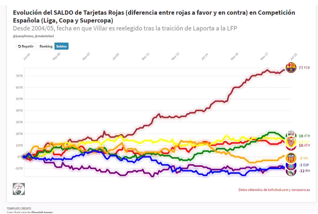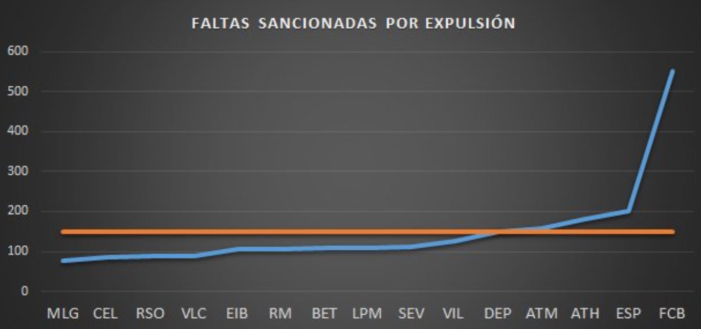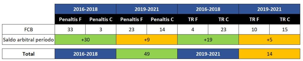 – Bueno, en el período 2016-2018, el Barça sufre solo 4 expulsiones, mientras que a sus rivales los expulsan hasta 23 veces. Y en el segundo período analizado, la diferencia es mucho menos llamativa, 10 tarjetas rojas propias, frente a 15 de los rivales.