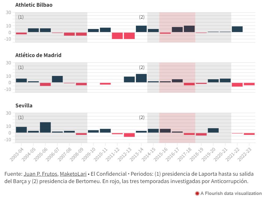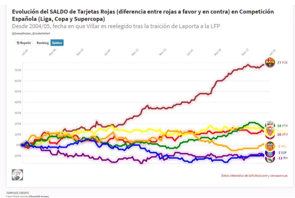 – En las primeras seis ligas analizadas -continuó Juanpa-, durante la primera época de Joan Laporta como presidente, había un saldo arbitral positivo para el Barcelona de +24 y era muy negativo para el Real Madrid, -11. Esa desproporción se iguala durante el segundo período, y se vuelve a desestabilizar a favor del Barcelona en la tercera, una etapa en la que el saldo a favor del Barcelona es muy superior al del Real Madrid, que es superado incluso por equipos como el Athletic de Bilbao o el Atlético de Madrid. Este gráfico es demoledor, porque el Real Madrid aparece con saldo negativo, por debajo de equipos que en aquellos años estuvieron en la zona media-baja de la tabla, mientras que el Fútbol Club Barcelona estaba claramente destacado por la parte superior.