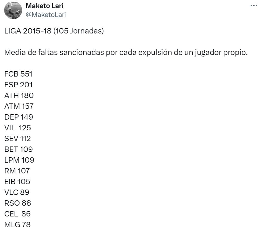 – Para responder esa cuestión -respondió el CEO en esta ocasión-, tenemos esta estadística, que es el cociente entre el número de faltas sancionadas y las tarjetas rojas de cada equipo.