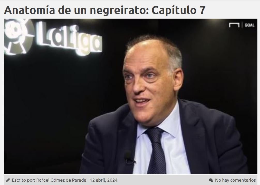 – No se ponga nervioso, señor Tebas, le ruego que se comporte, la Justicia dio la razón al periodista y al medio que lo publicó. Supongo que tampoco había conflicto de intereses al alcanzar acuerdos económicos entre el organismo que preside y Mediapro, la empresa que participa en el accionariado de Barça Studios, o por firmar operaciones de patrocinio con un jugador en activo del Fútbol Club Barcelona, Gerard Piqué. Para usted todo esto es normal, forma parte de los negocios y el día a día del fútbol, y aquí no hay más problemas que Florentino Pérez y los vídeos de Real Madrid Televisión.