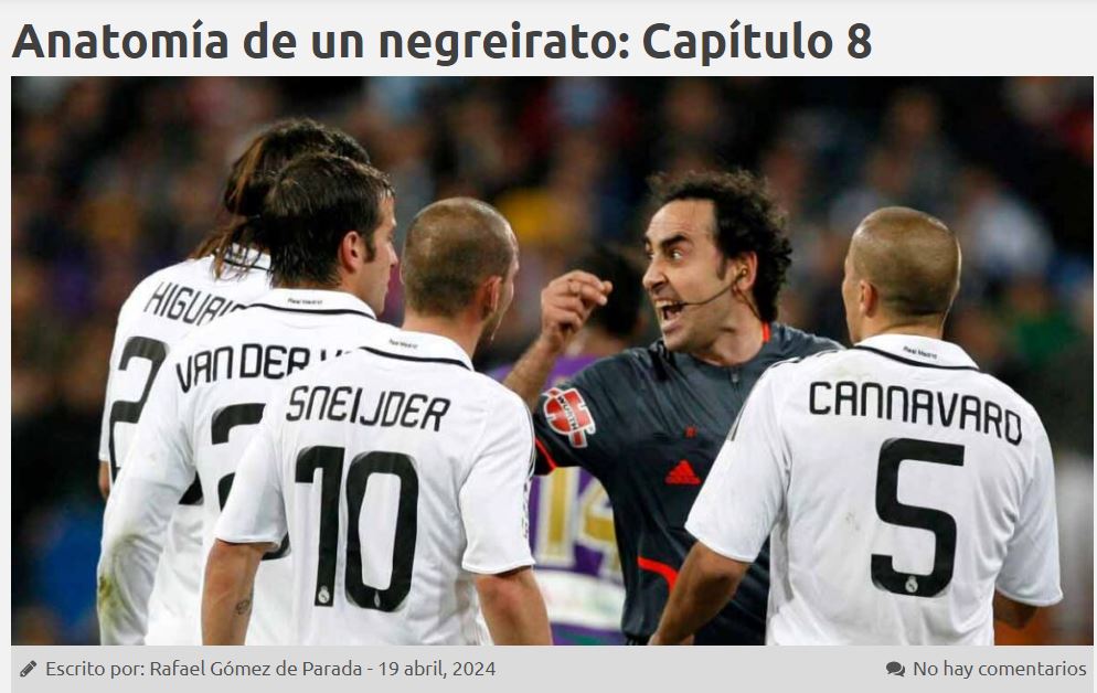– ¿Sabe usted lo que le ocurrió a aquel árbitro asistente que le avisó de la descomunal cag… del error de dejar seguir el juego? Fue descendido a Tercera. Ricardo Escudero Marín. De asistente en un Clásico a Tercera. Se retiró del arbitraje con 34 años. En cambio, el asistente que justificó a Zidane su decisión se mantuvo en la categoría. Y usted, como todos sus compañeros del CTA, saben todo esto. Con sus palabras en televisión, usted estaba comunicando al “Sistema Negreiro”, a ese sistema que premia y castiga de tal modo, que se encontraba muy tocado por su error, que no volvería a fallar en esa dirección.