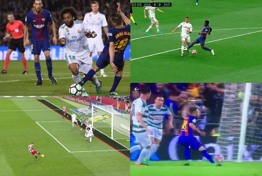 – Ya, lo entendemos, muy injusto. Los errores se reparten, a veces se favorece a unos, normalmente de azulgrana, y en ocasiones se perjudica a otros que habitualmente visten de blanco. ¡Tengo más! Mire, en ese mismo partido se come este penalti de Jordi Alba a Marcelo, pese a que estaba bien situado, como puede verse en la foto. Usted seguía sin pitar en Champions, ¡pero se le caían los Madrid-Barça de las manos! ¿No le llamaba la atención? Aquí vuelve a errar al no señalar un penalti de Umtiti a Cristiano, pero no se preocupe, que en sus estadísticas, el Barça ganó. Ah, también expulsó a Sergio Ramos en ese partido. ¿Cree que era por eso por lo que se le designaba para los partidos más importantes de cada temporada? En lugar de a los árbitros élite UEFA, como sus compañeros Mateu o Gil Manzano.