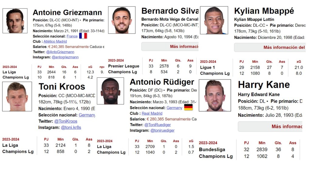 España: está jugando bastante bien, no tan bien como cantan nuestros entusiastas periodistas, encantados de que se les permita campar a sus anchas por la concentración (algunos se están cobrando cuentas pendientes con Luis Enrique), pero sí está mostrando un juego bastante sólido. Por lo menos, saben lo que hacen y juegan con un criterio. En estas alturas de la temporada, los jugadores de los principales clubes están fundidos: así se vio a Kroos, a Wirtz, a Modric, a Kane, Bernardo Silva, Jude Bellingham, Walker, Rice, a todos los italianos, a Mbappé y Griezmann… Son datos de la web FBREF y no incluye los partidos de selecciones: