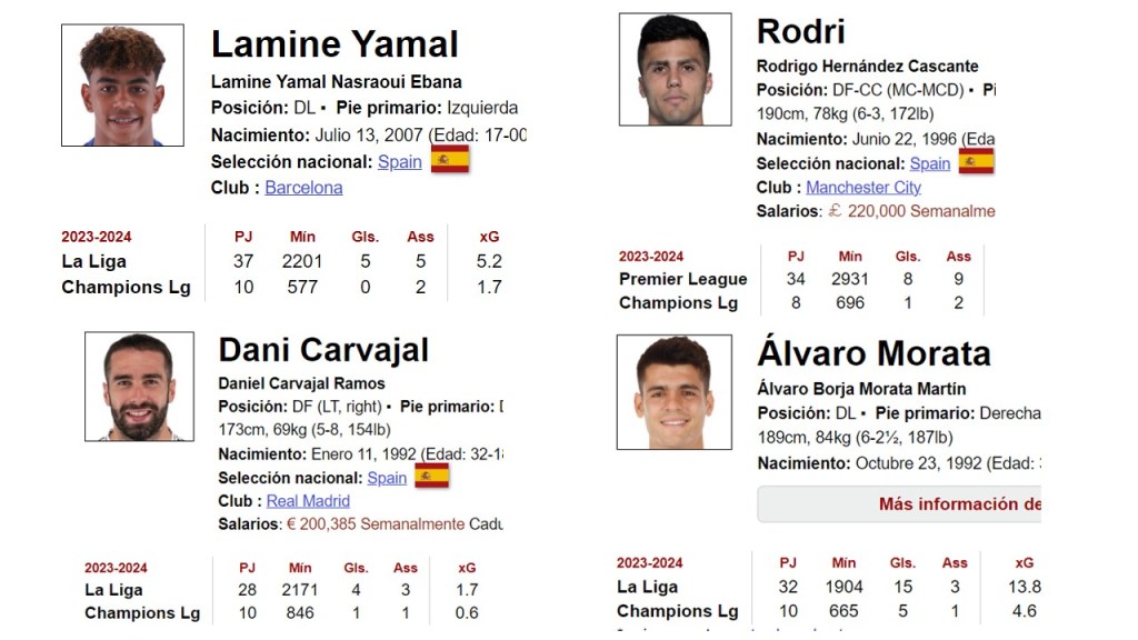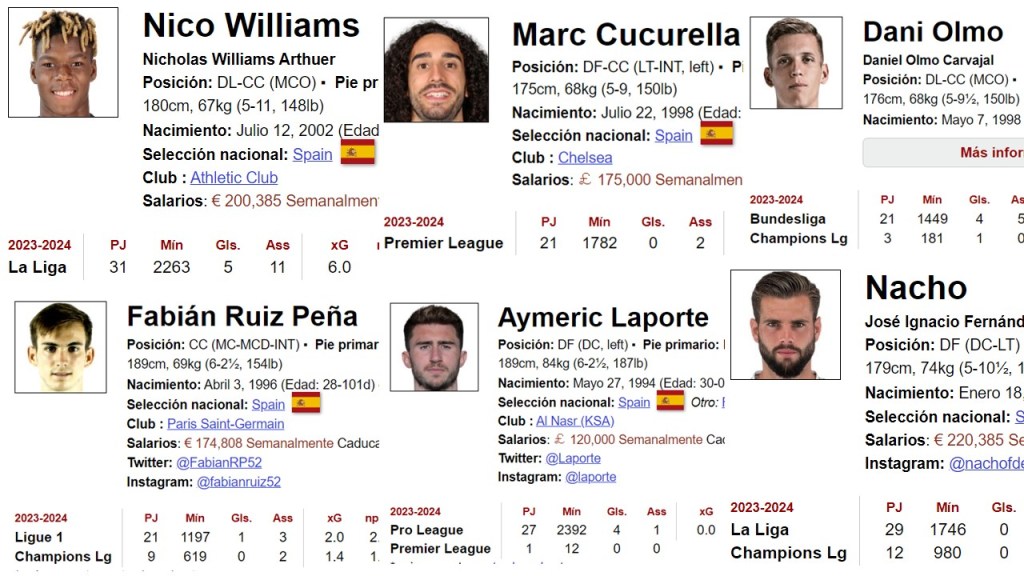 Todos ellos están muy por encima de los 3.000 minutos de juego. Por el contrario, en España están destacando jugadores que apenas sobrepasan los 2.000 minutos en sus respectivos equipos, o que no los alcanzan, bien porque no han jugado competiciones europeas, o bien porque no son titulares. Es el caso de Cucurella, Fabián, Nico Williams, Dani Olmo, Laporte…