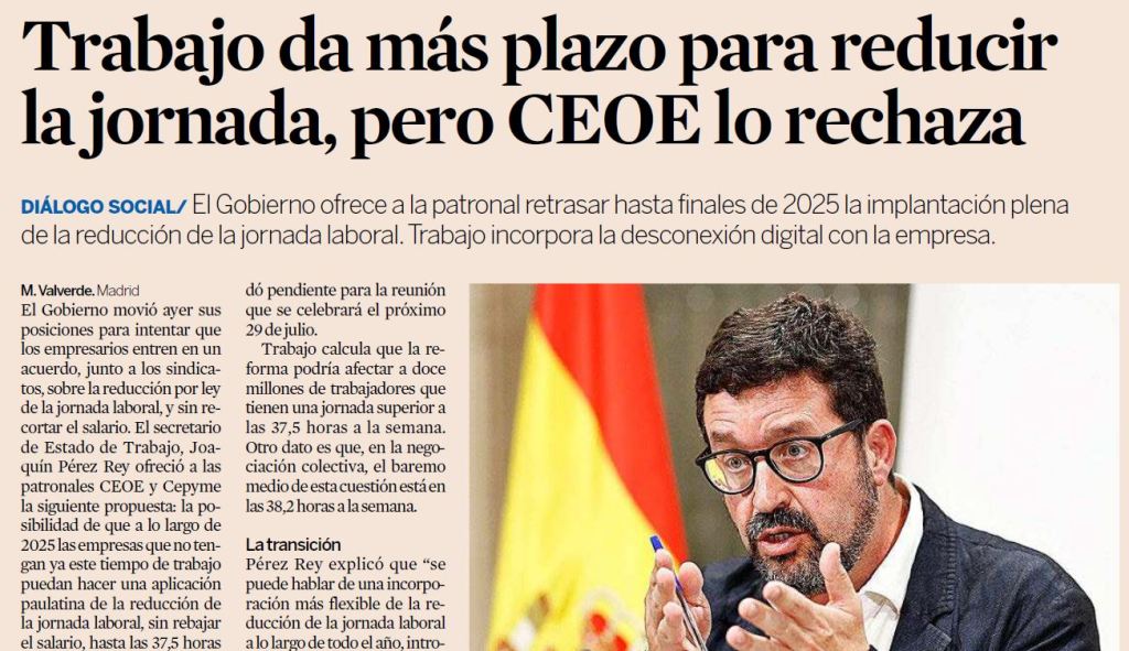 Lo que no está dispuesta a aceptar la patronal es el ultimátum de la ministra, como dijo su presidente en la asamblea anual celebrada a principios de julio, al afirmar que “gobierna contra las empresas”. “Gobernar para cumplir pactos políticos es gobernar contra las empresas, contra los ciudadanos y hasta contra los propios votantes”. La posición del ministerio de forzar el tope de las 37,5 horas semanales a lo largo de 2025 ha sido rechazada por la CEOE por hacer tabla rasa con todos los trabajadores y en todos los convenios: la reducción ya se pacta con los sindicatos en la negociación colectiva, en los sectores y empresas que pueden hacerlo. Esta es una de las claves, en especial, en un mundo tan globalizado en el que los competidores no juegan con las mismas reglas (lo comentado en este blog sobre el CBAM, los derechos de emisión o la normativa sobre el plástico es igualmente válido en este debate).