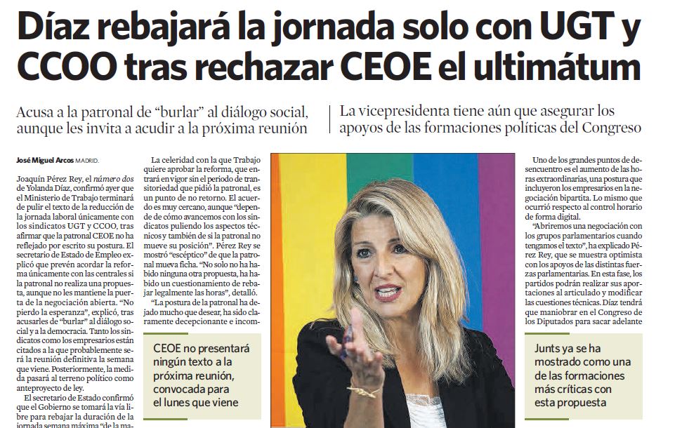 No sé si el afán de la ministra por forzar la situación y amenazar con aprobar la medida por decreto se debe a la necesidad que tiene de hacerse visible o “útil” tras los fracasos electorales de su nueva marca, pero si así fuera, alguien tendría que decirle que hay otra manera de hacer las cosas y alcanzar un consenso. Ha puesto varias fechas límite y ultimátums a la patronal para adoptar la medida sin valorar que no se puede hacer tabla rasa en todos los convenios.