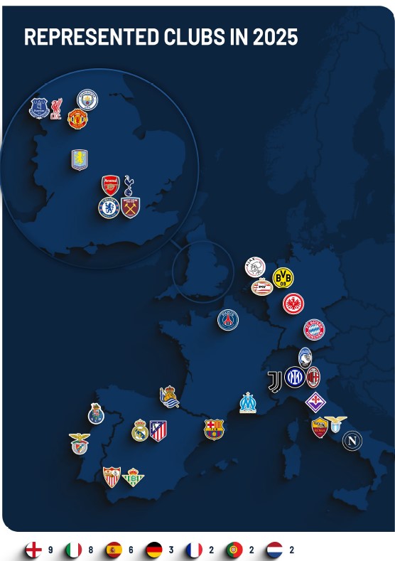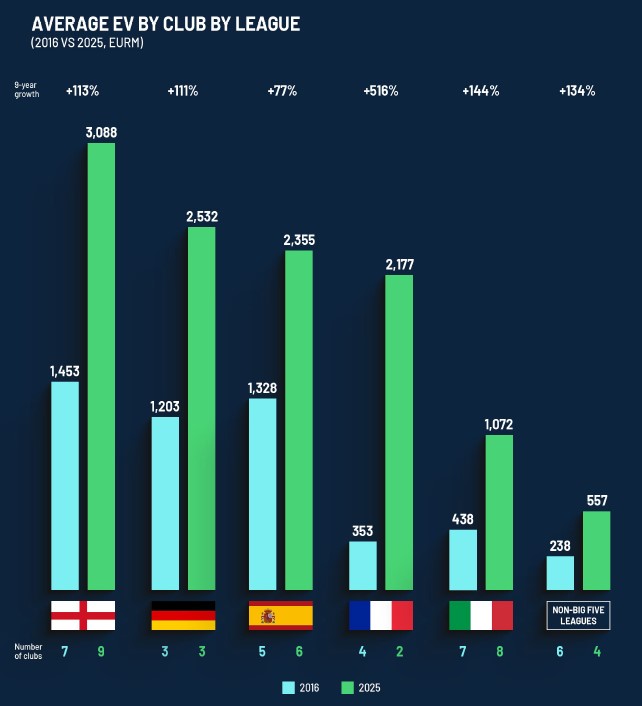 En cuanto a la comparación por ligas nacionales, destaca el despegue de la Premier respecto al resto de campeonatos. LaLiga ha perdido la segunda posición frente a la Bundesliga, si bien España sube de cinco a seis equipos en el análisis del top-32, mientras que Alemania se queda en tres. Francia no es representativo por el peso del PSG sobre el global, que influye notablemente en la media. Italia por su parte sigue muy lejos, pagando aún las consecuencias del Moggigate y de los nefastos inversores que pasaron por algunos clubes como el Inter o la Roma.