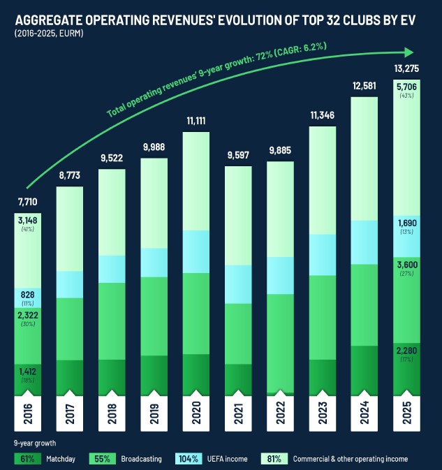 El informe analiza después el enorme crecimiento de los ingresos del fútbol en esta última década y separa los repartos de ingresos de la UEFA, los derechos de televisión, taquilla en días de partido y otros ingresos por comercialización.