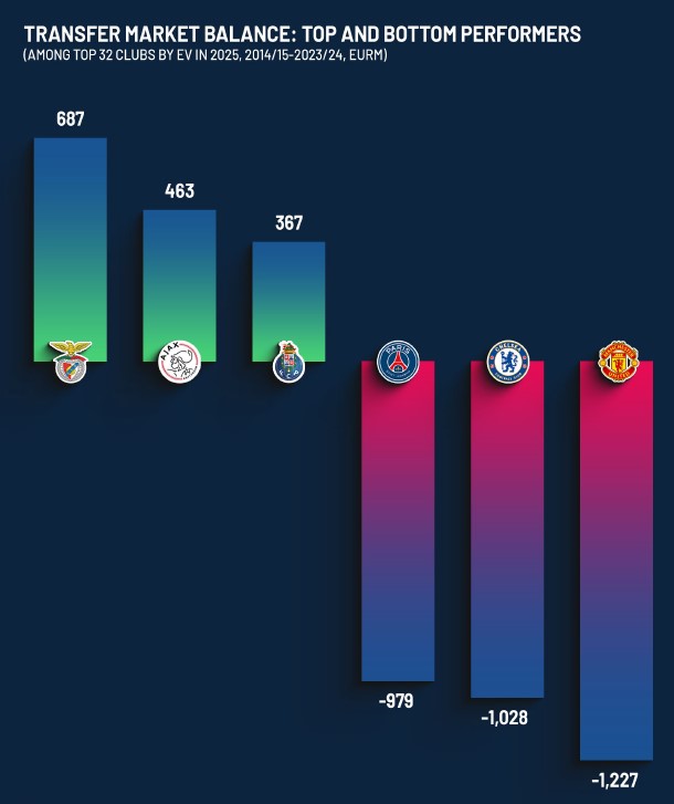 En cuanto al market balance, o balance de mercado, el informe destaca los clubes que mejor han comprado o vendido. Los portugueses siempre han sabido gestionar bien sus activos (Benfica y Oporto), igual que el Ajax, mientras que el gasto descontrolado no garantiza el éxito, como se puede ver en el caso del Manchester United, pero sí ayuda (City y PSG).