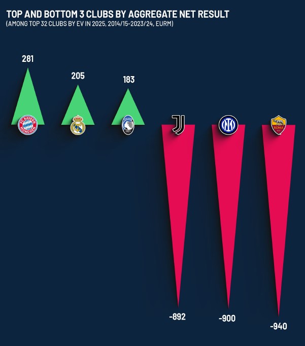 Las cifras son tremendas, y habrá más clubes que sufran o desaparezcan en los próximos años, como hemos sabido esta semana que ocurrirá con el Brescia. La crisis del fútbol italiano no termina de cerrarse. Si sus clubes no estaban en los peores puestos entre los más «gastadores» o compradores, sí lo están en la lista de resultados, en la que destaca la buena gestión del Bayern Múnich, Real Madrid y Atalanta: