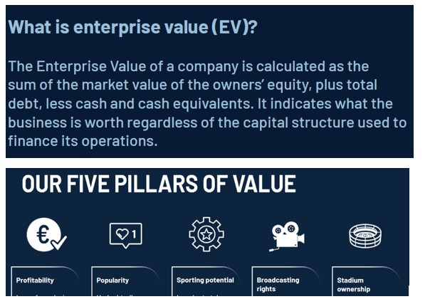 Mi mayor crítica al informe viene porque el cálculo del Enterprise Value (EV, valor de los clubes) se basa más en expectativas que en resultados financieros, más en la teórica capacidad de generar ingresos que en el modo de conseguirlos (gestión sostenible, deuda, capital externo…). Sus autores utilizan una aproximación por un múltiplo de los ingresos porque dice que son menos volátiles que los resultados, más fáciles de comparar y están menos distorsionados por ajustes contables. Este múltiplo se realiza con un algoritmo propio basado en varios criterios que tratan de reflejar esa capacidad de generar ingresos: valor de marca, atractivo de la plantilla, número de seguidores… Las marcas Real Madrid y Barcelona son mundialmente conocidas, y el grupo de Abu Dábi ha hecho un enorme esfuerzo con los clubes satélites para promocionar la imagen del City por el mundo.