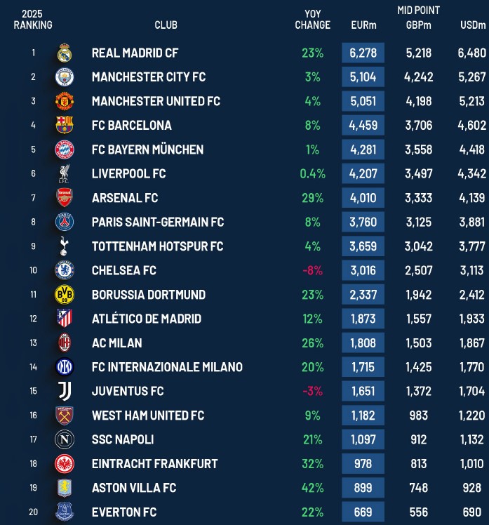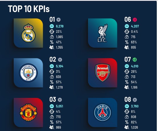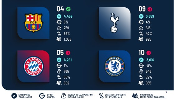 Como indica el informe en sus primeras páginas, el Real Madrid lidera la clasificación por su excepcional año dentro y fuera de la cancha. Destaca los logros deportivos en Liga y Champions (hablamos de 2024), pero también su buena situación financiera, entre otras razones, por el impacto del renovado estadio (no entra en las críticas que se han hecho al mismo, muchas de ellas merecidas).