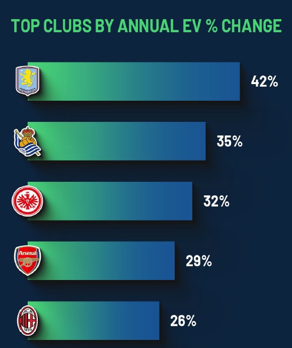 - Variación anual del Enterprise Value. Destaca el importante crecimiento de un club como el Arsenal y el 23% del Real Madrid, un porcentaje significativo cuando ya se partía de cifras muy altas.