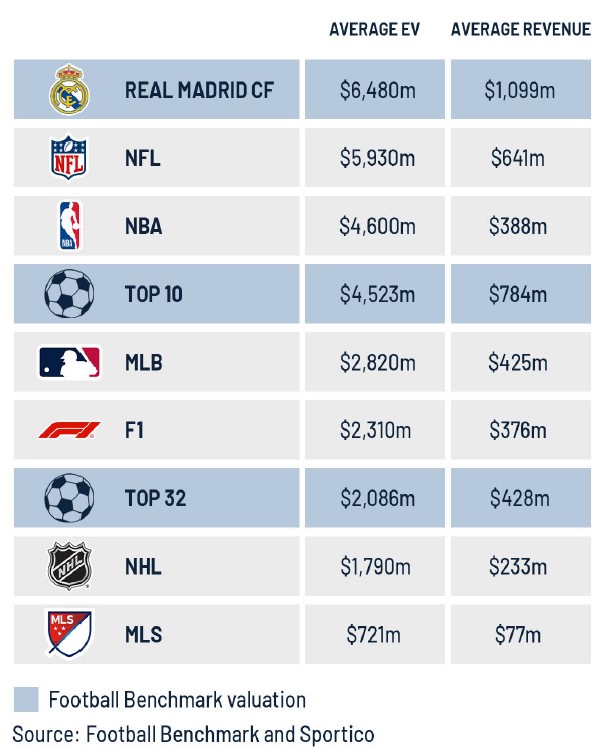 Y una de las comparaciones que me ha parecido de más interés está en este cuadro en el que compara la valoración de estos 32 clubes europeos con otras entidades de otros deportes, como la NBA, la MLS o la Fórmula 1: