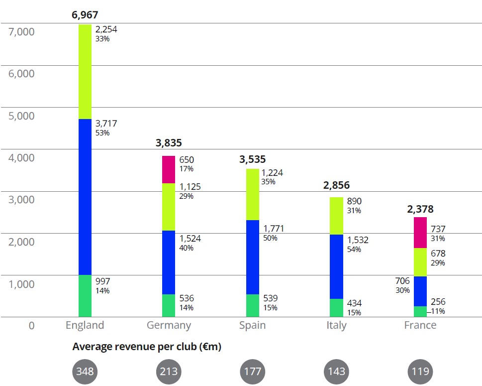 Me parece relevante completar esta información con la tabla del Informe de Deloitte que recoge los ingresos totales de los campeonatos, así como el tamaño medio por equipo, y la diferencia es abismal.