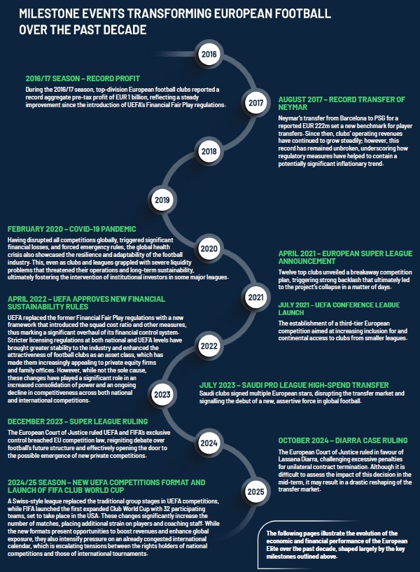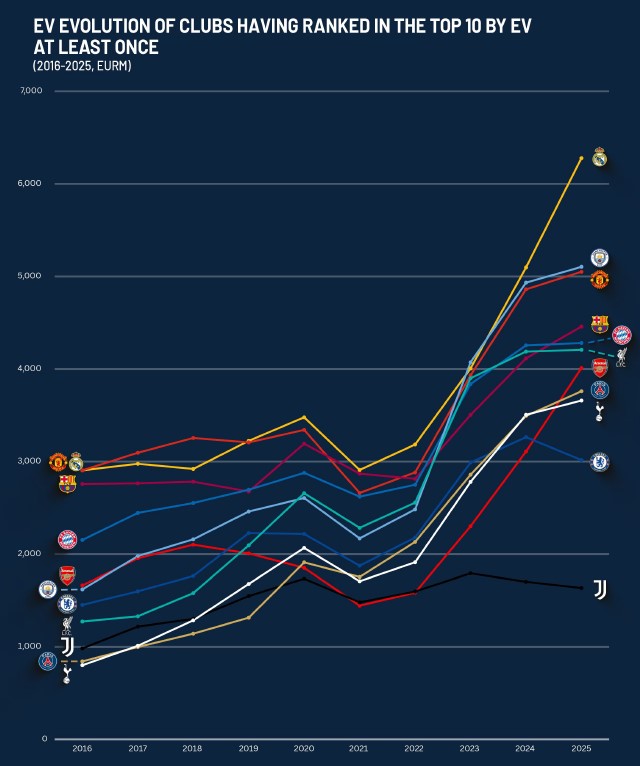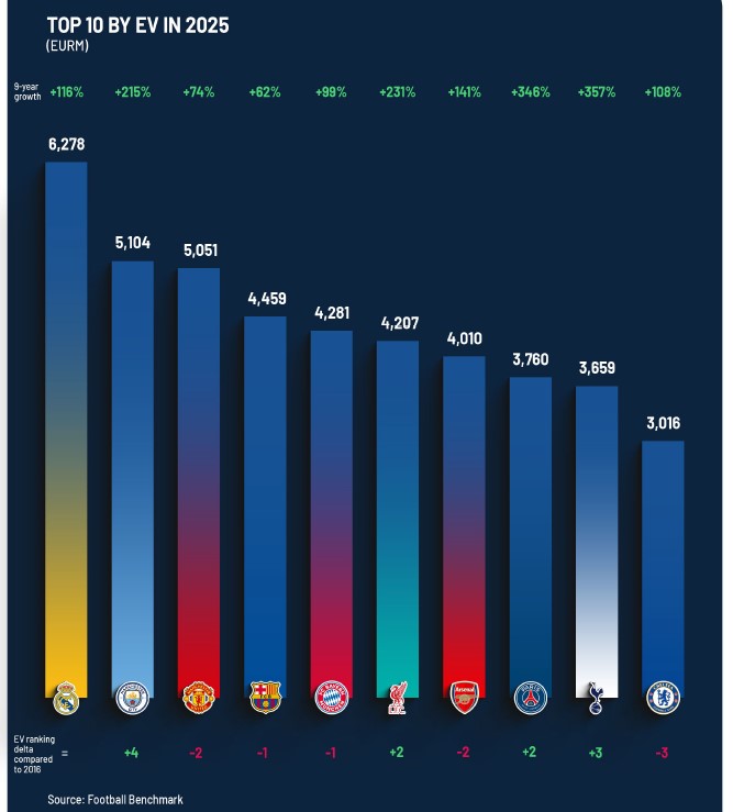 El informe recoge el período de los últimos 10 años, de 2016 a 2025, y destaca el enorme crecimiento del mercado en este tiempo, con datos como el incremento de un 146% del valor de los clubes, hasta los 64.700 M. EUR. Los aspectos más destacables para Andrea Sartori, CEO de Football Benchmark, los highlights, son los siguientes: