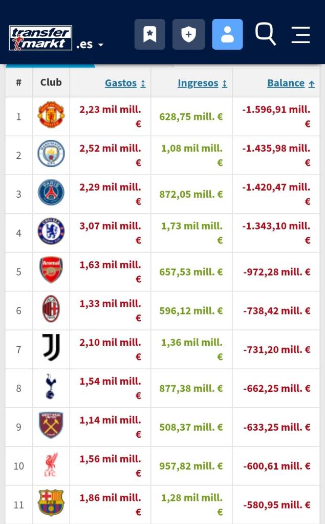 Clubes «gastones» como el Chelsea, el City o el PSG han logrado sus Champions, pero otros como el Manchester United, el Arsenal, Milan o Juventus llevan años sin acercarse a estos triunfos. Por el contrario, el Real Madrid es el 16º en esta clasificación con el neto de traspasos. Ahí también hay mucha gestión, pero mucho sacrificio, como las ventas (Casemiro, Cristiano, Varane, Di María, Morata, Achraf, Reguilón… y tantos otros) o no cubrir puestos necesarios, como ha sucedido este año con todos los lesionados en la defensa. Siempre hay que tomar estos datos con cierta distancia, porque no todo es transparente en el mundo del fútbol, sino más bien al contrario. A veces no es posible conocer todos los extras que se han pagado por un fichaje, como ocurrió con Neymar, Mbappé o el noruego Haaland.