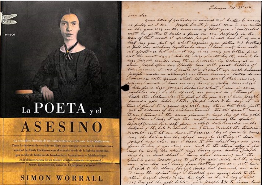 La poeta y el asesino es un libro sorprendente que recoge la investigación realizada por el periodista Simon Worrall acerca de la figura de Mark Hofmann, uno de los mejores falsificadores que hayan existido nunca, si no el mejor, habida cuenta de lo que el libro narra. La vida de Mark Hofmann es doblemente fascinante, por su habilidad para elaborar documentos que luego vendía como originales, ya fuera un poema de Emily Dickinson, autógrafos de Lincoln, cartas de Mark Twain o George Washington, y por su capacidad para vivir una vida paralela como respetado miembro de la comunidad mormona en Salt Lake City, una religión (o secta) a la que despreciaba profundamente.