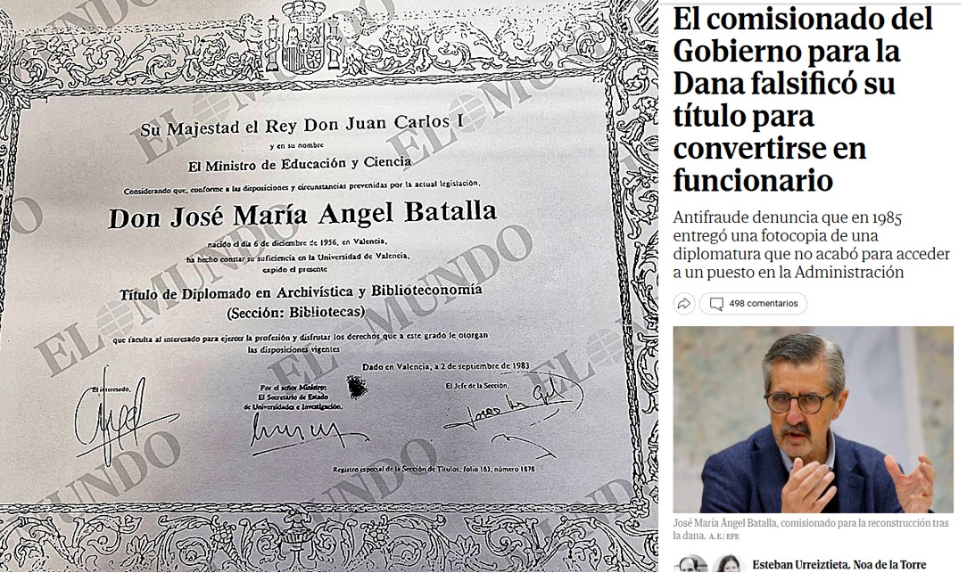 Lo peor que he visto últimamente ha sido la defensa de la ministra de Universidades, Diana Morant, de la falsificación del título universitario de su compañero de filas, José María Ángel Batalla. Coño, que ya lo explicó El Mundo en el artículo que enlazo aquí: este señor ha cobrado cuatro décadas un salario público porque cogió un título oficial y lo falsificó de manera cutre, ni siquiera con el “arte” de Hofmann. Cierto es que en la política, y en tu mismo partido, es fácil encontrar a mucho crédulo interesado que colabore para que la mentira perdure varias décadas. Aunque sean ministros.