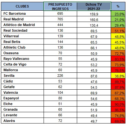 En el post de hace dos temporadas sobre el declive económico de LaLiga, incluí un cuadro sobre el peso que tienen los derechos de televisión en los ingresos de los clubes de Primera, y marqué en narana y rojo aquellos en los que superaban el 50% o el 70%, respectivamente. Clubes demasiado dependientes de esta fuente de ingresos que controla el equipo de Tebas.