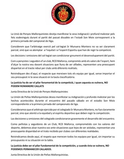 Parece como si los demás clubes tuvieran miedo a señalar y denunciar las malas prácticas del Fútbol Club Barcelona, y ni siquiera sé si Tebas tiene algo que ver o no en este modo de comportarse. Por ejemplo, esta misma temporada, con el comunicado de las peñas del Mallorca ante el pésimo arbitraje de la primera jornada en su enfrentamiento con el cliente único de Negreira: