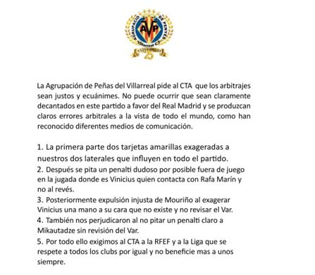 No hay una sola mención al Fútbol Club Barcelona, algo que nunca falta cuando se trata de atacar al Real Madrid. Como hicieron las peñas del Villarreal tras jugar en el Bernabéu en un partido en el que, por cierto, hubo más errores en contra del Real Madrid que a favor: