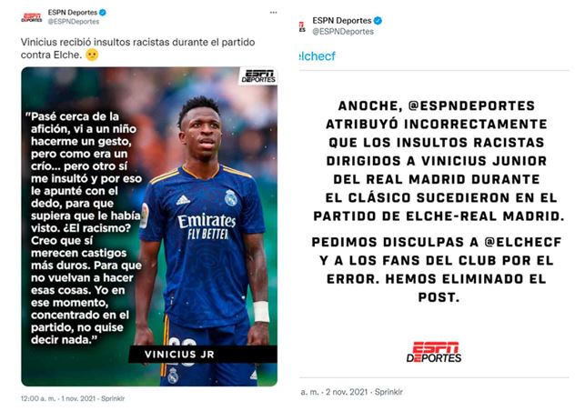La redacción es espantosa, pero no hay problema en señalar siempre al club blanco. Mi ejemplo favorito es de la cadena proculé ESPN, cuando quiso mencionar el episodio racista sufrido por Vinicius en el Camp Nou (aquel aficionado pronunciando el “macaco” a cara desscubierta, perfectamente visible, pero que, oh, lástima, no pudo ser identificado). El comunicado no solo puso que había sucedido en el campo del Elche, sino que, cuando se les pidió rectificar, mencionaron dos veces al Madrid y ni una sola al Barça. ¡Es puro Orwell!