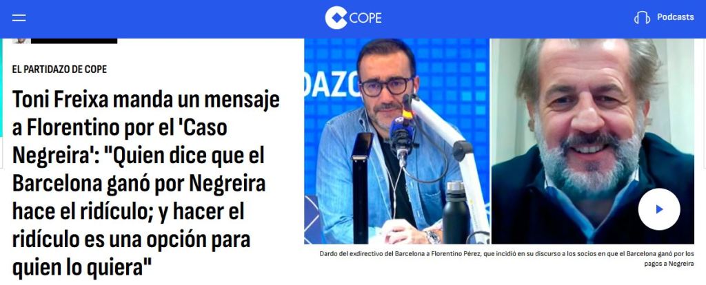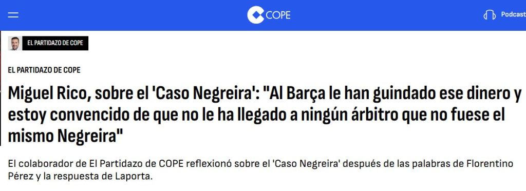 La Cope es otro de esos medios que lleva desinformando desde el inicio del caso, dando voz a supuestos especialistas que casualmente siempre dan la visión de que «hay que mirar hacia delante que aquí no ha habido corrupción deportiva». Y además, le da un micro a un tipo maleducado, macarra y fullero como Isaac Fouto, portavoz oficioso del CTA y de LaLiga, un tipo resentido, antimadridista, que insulta a todo el que hable del caso Negreira como lo que es: un puñetero escándalo, una vergüenza.