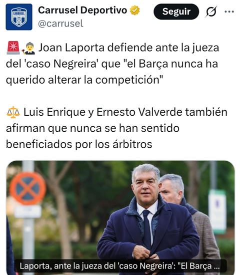 Vaya. Con la versión del presidente, con la negación del club y sus anteriores entrenadores acerca de los favores. ¿De verdad? ¿Ni un comentario sobre las incongruencias declaradas o sobre el hecho de que Laporta basara su defensa en unos informes inexistentes, millonarios, que no llegaron a sus destinatarios porque directamente no existían? ¿O que los únicos mostrados por el club eran del hijo, cuyos emolumentos no eran aquellos por los que se le preguntaba, y que tratara de engañar a la jueza diciendo que eran por los que pagaban a Dasnil? ¿De verdad este es el trabajo de un periodista?