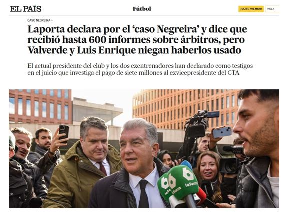 El pasado viernes 12 de diciembre, el presidente del Barça Joan Laporta acudió a declarar al juzgado de Barcelona que instruye el denominado caso Negreira. El máximo dirigente azulgrana estuvo cerca de una hora con un tono evasivo, poco preparado, incluso maleducado, por no dirigirse en castellano nada más que a su abogado, no así al fiscal ni al representante del Real Madrid. Se puede ver su declaración completa en el canal de Ramón Álvarez de Mon (enlace). Estuvo bastante impreciso en sus respuestas, por no decir que mintió abiertamente, como algunos blogueros, youtubers y gente del mundo Twitter (con formación jurídica) han demostrado tras comparar sus respuestas con la documentación conocida o existente en el propio caso.
