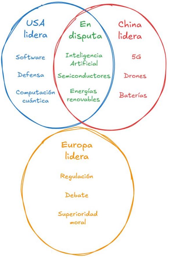 Una pena, pero no lo veo. De hecho, Europa pinta cada vez menos en el contexto internacional. La Unión Europea parece un foso de legisladores. Francia está muy tocada, Reino Unido se ahoga en sus propios problemas, Alemania no termina de arrancar y los países nórdicos no tienen peso suficiente para tirar del resto. La invasión de Ucrania y los chantajes de Trump han demostrado nuestra inutilidad para defender ese mercado común, teóricamente próspero y moralmente superior, al menos en nuestras creencias como europeos. Como dice Leo Harlem, si España está al frente de una clasificación, malo. Y no hacen más que contarnos que nuestra economía, con todas sus deficiencias, es la más pujante de Europa. Como definía muy bien este diagrama de Óscar Juliá: